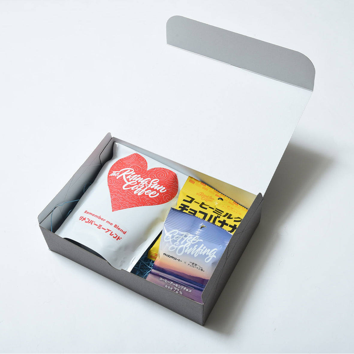 リメンバーミーブレンドのコーヒー豆と、 2種類のチョコレートを詰めました。