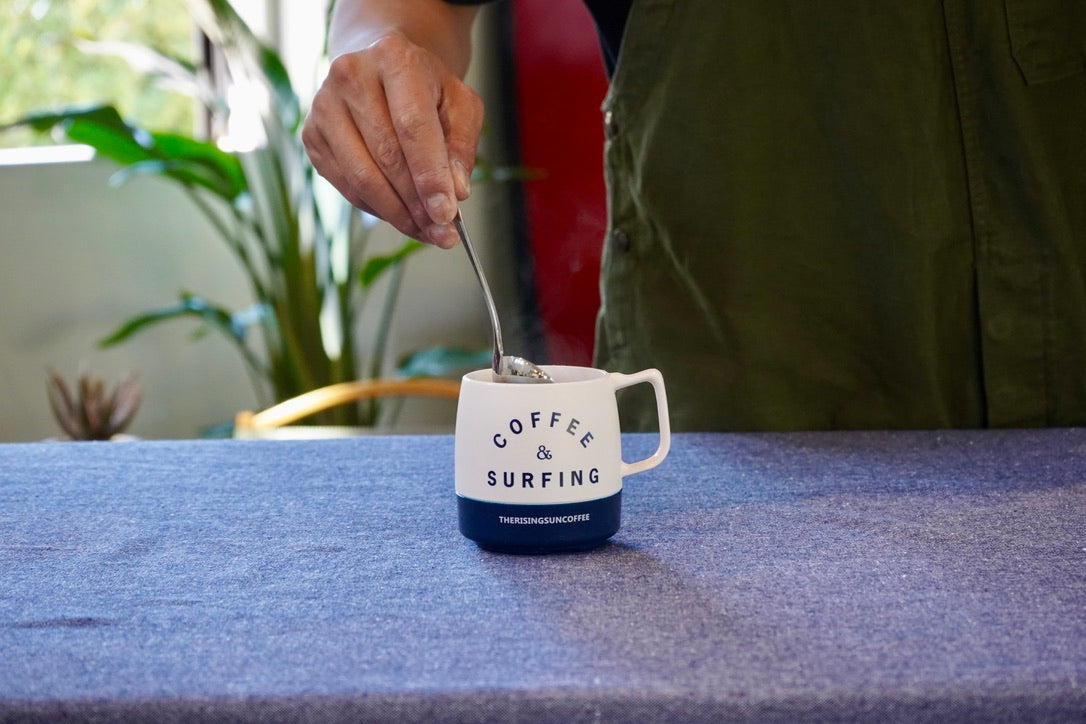 マグカップ内のコーヒーは、下のほうが濃く、上の方が薄くなっています。かき混ぜることで均一にしてからお楽しみください!