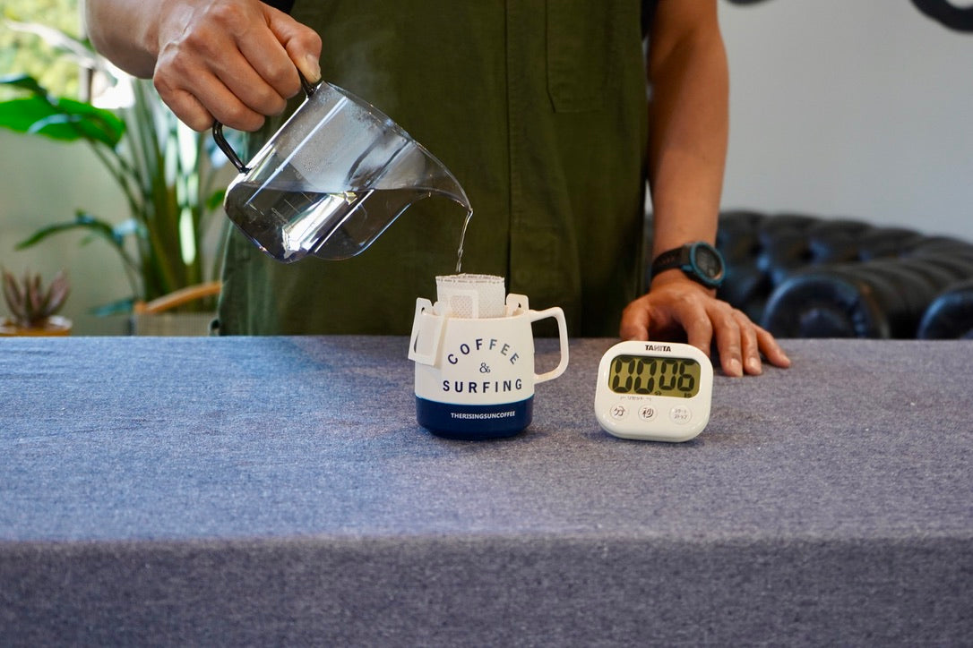 30秒経ったら、残りのケトルのお湯を3回に分けて注ぎきります。