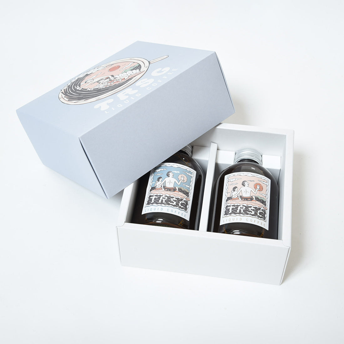 TRSC焙煎のコーヒー豆を濃縮したオリジナルラテベースのギフトセット。「無糖」と「微糖」1本ずつが、オリジナルのギフトボックスに入っております。牛乳や豆乳で割ったラテや、アイスクリームにかけてアフォガードなど、幅広くご利用いただけます。