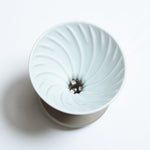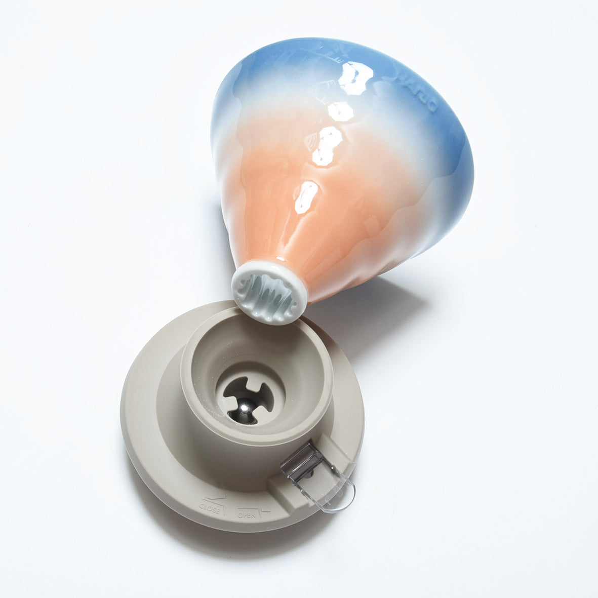 ドリッパー部は、400年の歴史を誇る有田焼の町、佐賀県有田町で、職人がひとつひとつ丁寧に製作しています。試作段階では、磁器にグラデーションをかけることが難しく、青からオレンジにかけて自然な濃淡を出すため、何度も改良を重ねました。磁器ならではの美しいグラデーションを感じる、日本の職人技術が光る逸品に仕上がりました。